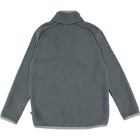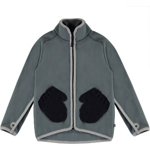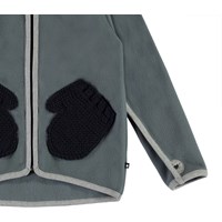 Ushi is a grey polar fleece jacket with a high collar, a front zip closure and thumb holes. The fleece jacket has lovely front knit pockets that look like small mittens. Wear it alone or, on very cold days, as an extra layer under another jacket.