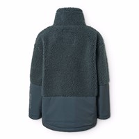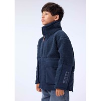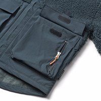 Dark blue fleece jacket made of recycled polyester with details on the sleeves, back, and exterior front pockets which is made of wind and water-repellent durable nylon. The jacket has a high collar and a front zipper.