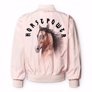 Pink, water-resistant (PFC-free: PFOS and PFOA) bomber jacket in recycled polyester with a print on the back and chest of a horse and the text 'Horsepower'. The jacket has a regular fit, zip closure at the front, ribbed edges at the collar, waist, and armholes.