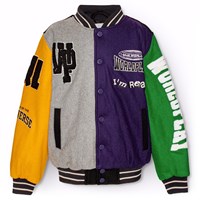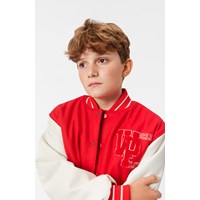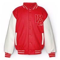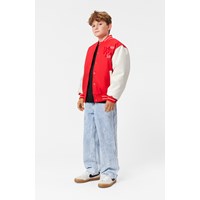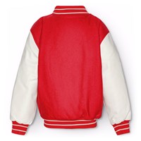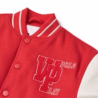 Red baseball jacket with white sleeves. The jacket has snaps on the front, white piped pockets, and striped ribbed edges at the neck, sleeve cuffs, and waist. The jacket is made from a wool blend, which helps to regulate the temperature. The jacket has an embroidery on the front with the text "World Play", which is about how play is not only fun but also a crucial way to learn and develop.