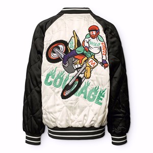 Quilted bomber jacket in black and off-white with an embroidered back patch of a motocross rider and the text 'Courage'. The bomber jacket features striped ribbed edges at the neck, cuffs, and waist, as well as front pockets and snap buttons at the front.