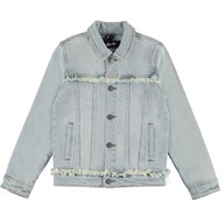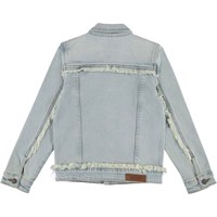 Hattie is a light blue denim jacket with fringe details. The jacket has a button closure on the front.