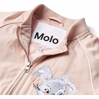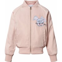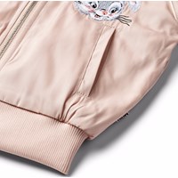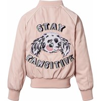 Pink bomber jacket with an embroidered back patch of a cute dog and the text "Stay pawsitive". The bomber jacket has a regular fit, front pockets, practical zip closure, and ribbed edges at the neck, wrists, and waist.