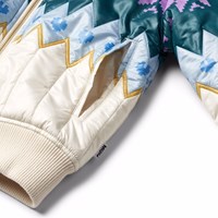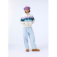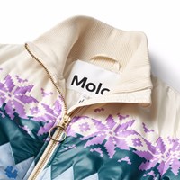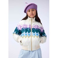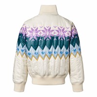 Off-white quilted jacket with Norwegian-inspired pattern in multiple colours. The jacket has a close-fitting silhouette, a front zipper, side pockets, ribbed cuffs around the wrists, neckline, and bottom.