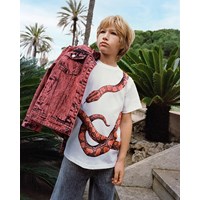 Red denim jacket in washed cotton look. The jacket has a loose fit, shirt collar, button closure at the front, side pockets, chest pockets, and adjustable snap buttons at the back. Sizes 92-134 come with snap buttons, making it easier for children to close the jacket themselves. Sizes 140-176 come with a regular button closure.
