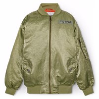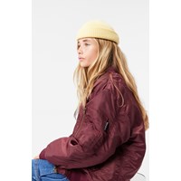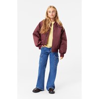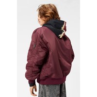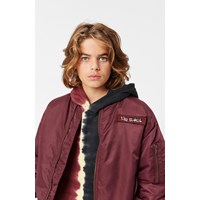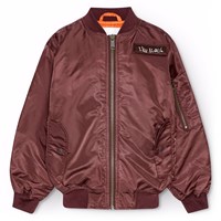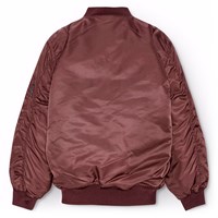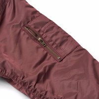 Classic burgundy bomber jacket with ribbed edges and practical pockets on the front and sleeves. The sleeves also have extra width and decorative wrinkle-seams along the entire length of the back of the sleeves. The inside is lightly padded and features an orange quilted lining with a small inner pocket that closes with a button. On the chest, there's a removable embroidered patch with the words "Im Real."