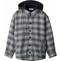 Checked white and black overshirt made of soft organic cotton. The overshirt has a loose fit, a black jersey hood, button closure, and long sleeves with cuffs and button closure. The overshirt is lined with soft black jersey, making it comfortable to wear and ideal for transitional periods or as an extra layer on cooler days.