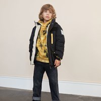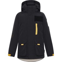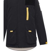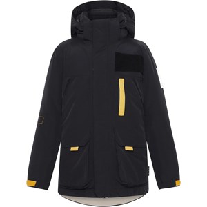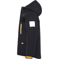 Harding is a black jacket with yellow details at the zipper and velcro. It has large pockets on the front and a detachable hood as well as large reflectors on the side and the back. The jacket is windproof and waterproof and has a breathable membrane and taped seams at the neck, armholes and shoulders. The outer fabric is 100% recycled and made of recycled plastic bottles. The outer fabric has a water resistant, PFC-free surface treatment (Does not contain, e.g. PFOS, PFOA, etc). Water column pressure: 10.000 mm. breathable: 8.000 g/m2/24hr.
