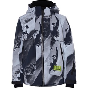 Alpine is a functional and waterproof ski jacket in a snowboard print in grey tones. It has a detachable hood, a front zip and large, roomy pockets at the sides. It has adjustable sleeve openings with a snug wind flap with thumb holes and a reflective stripe on the back. The jacket is constructed in a windproof and waterproof quality that is breathable. It is lined in 3M™ Thinsulate™ and has high quality fleece in vulnerable places as well as taped seams. This product has a water resistant, PFC-free surface treatment (Does not contain, e.g. PFOS, PFOA, etc). The water column pressure and breathability are improved and are now 15.000 mm for the water column pressure and breathability: 15.000 g/m2/24hrs.