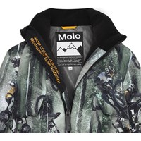 Alpine is a functional, waterproof ski jacket in green tones with a print of mountain bikes. It has a detachable hood, a zip front closure, large, roomy side pockets and adjustable sleeve openings with snow flaps and thumb holes. The jacket has a reflective stripe on the back. The lining and interlining are recycled and made of recycled polyester. Alpine is windproof, waterproof and breathable and has taped seams. This product has a water resistant, PFC-free surface treatment (Does not contain, e.g. PFOS, PFOA, etc). The water column pressure and breathability are greatly improved and are now: water coloumn pressure: 15.000 mm and breathable: 15.000 g/m2/24hr.