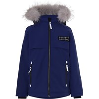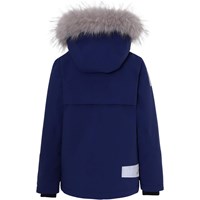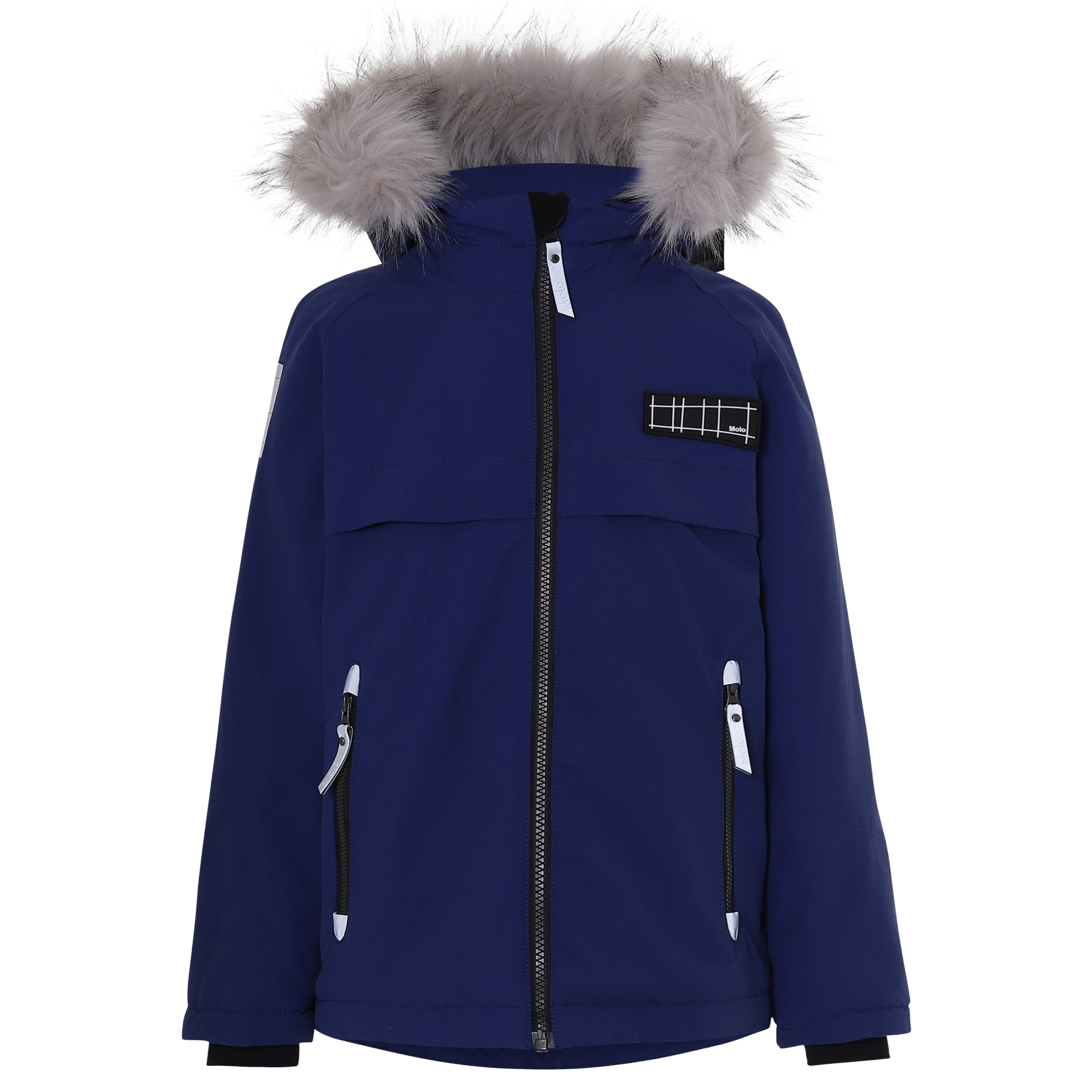 Cathy Fur Recycle is a functional, lined winter jacket in blue. It has a detachable hood with a faux fur edge (also detachable). The Jacket has a hidden zip front with placket, roomy pockets, an adjustable elastic waist and Molo's iconic star reflector on the back. The jacket is windproof, waterproof and breathable and is lined in 3M™ Thinsulate™. It has a high quality fleece in vulnerable places and taped seams. The outer material is constructed in 59% recycled nylon from waste. This product has a water resistant, PFC-free surface treatment (Does not contain, e.g. PFOS, PFOA, etc). Water column pressure: 15.000 mm. Breathability: 15.000 g/m2/24hrs.