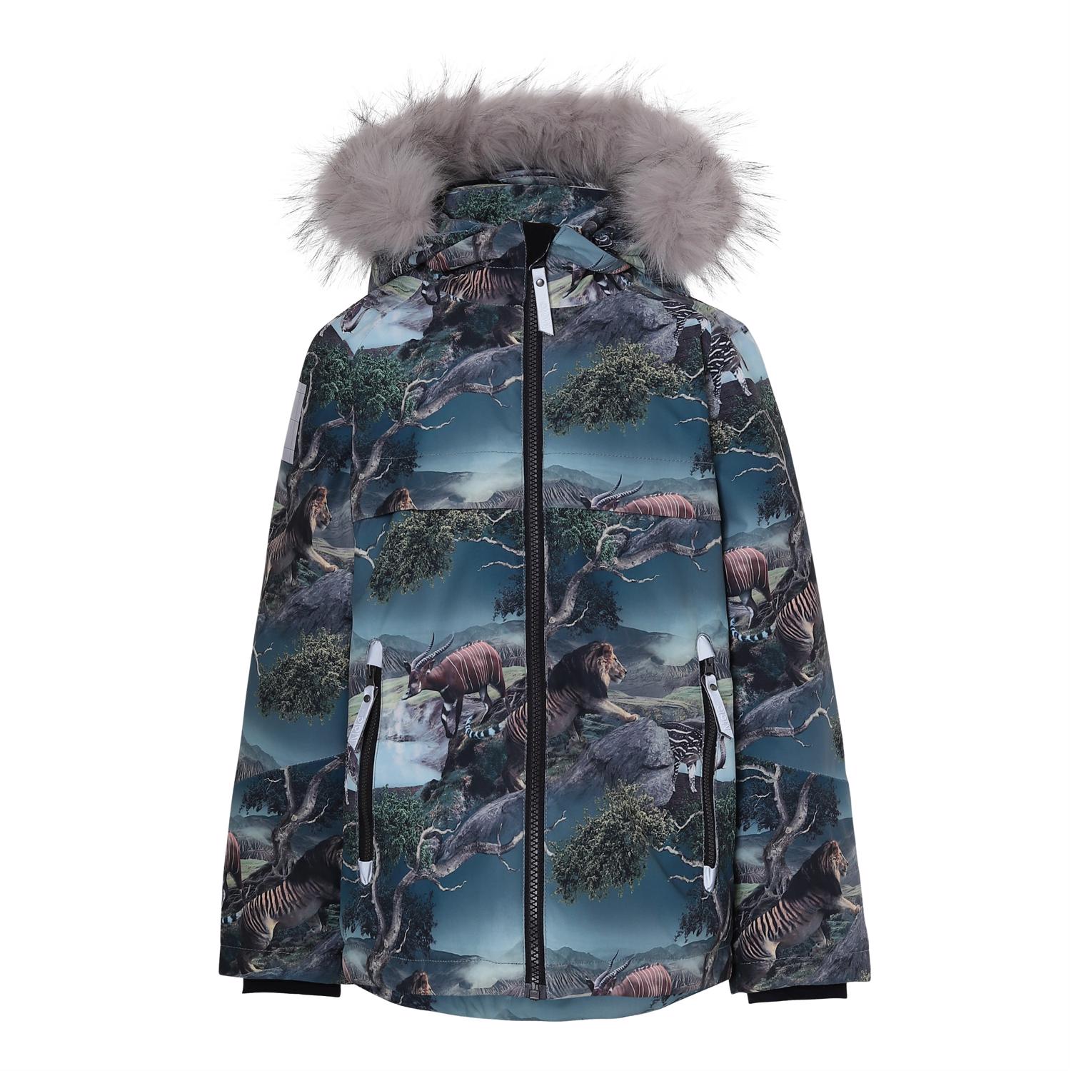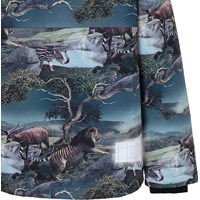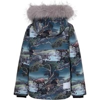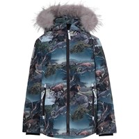 Castor is a lined and waterproof winter jacket in a print of futuristic animals. The jacket has a detachable hood with a faux fur edge (also detachable), a hidden zipper with a placket, hidden pockets, Molo's iconic star reflector on the back and elastic at the sleeves and bottom. The jacket is constructed in a windproof and waterproof quality that is breathable. It is lined in 3M™ Thinsulate™ and has high quality fleece in vulnerable places as well as taped seams. This product has a water resistant, PFC-free surface treatment (Does not contain, e.g. PFOS, PFOA, etc). The water column pressure and breathability are improved and are now 15.000 mm for the water column pressure and breathability: 15.000 g/m2/24hrs.