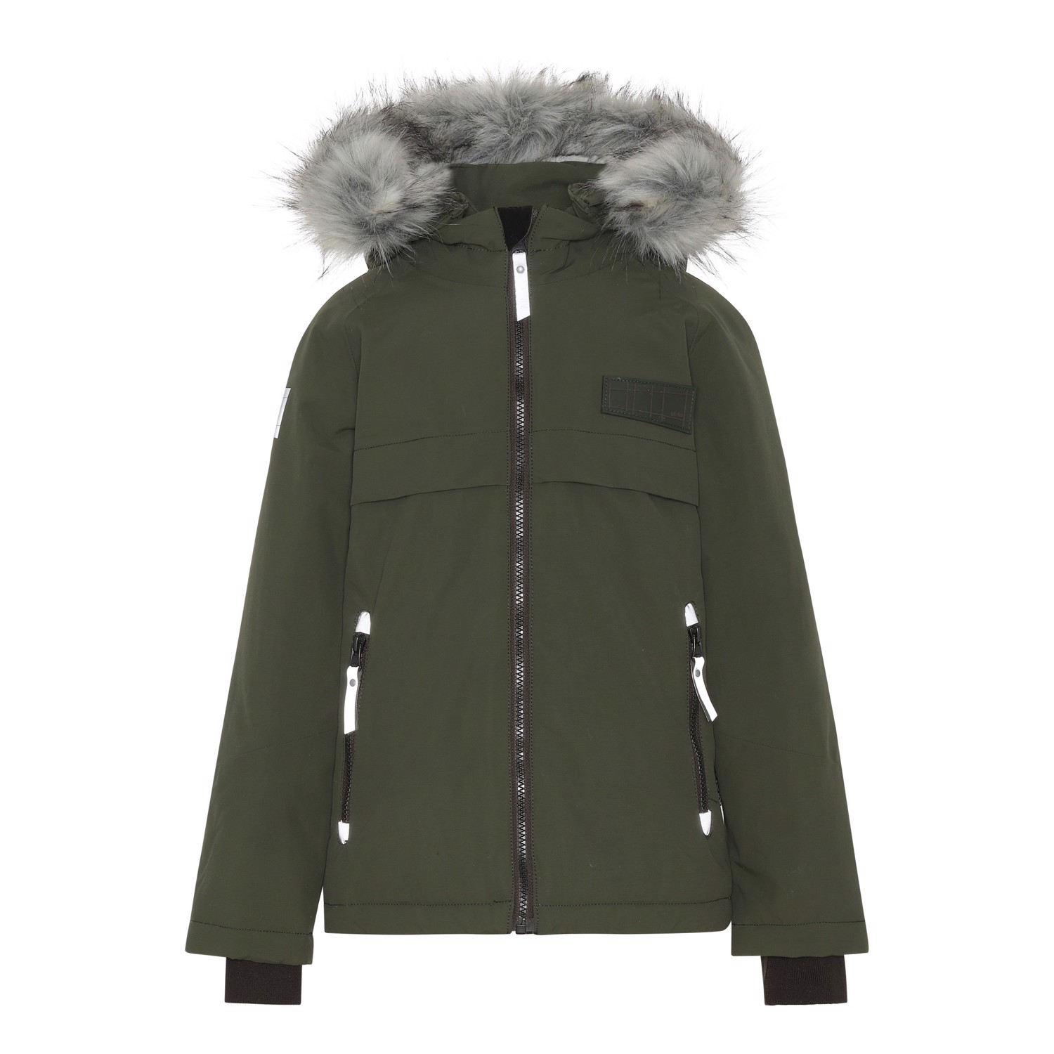 Castor Fur is a lined, waterproof winter jacket in green. Castor is perfect for extremely cold days but also ordinary winter days. The high level of breathability helps regulate a child's body temperature so it does not become too cold or over heated. On warmer winter days, a child can wear the jacket with a thin under layer, but on extremely cold days, you can add an extra layer underneath. Castor is also a good choice for less active moments. The jacket has a detachable faux furt rim on the hood, a covered zip closure, concealed pockets, visible reflectors on the side of the sleeves and on the back. The jacket is constructed in windproof, waterproof and breathable materials. The outer fabric is made from 59% recycled nylon, the 3M™ Thinsulate™ padding from 78% recycled polyester and the lining from 100% recycled polyester. This product has a water resistant, PFC-free surface treatment (Does not contain, e.g. PFOS, PFOA, etc). Water column pressure: 15.000 mm. Breathable: 15.000 g/m2/24hr.
