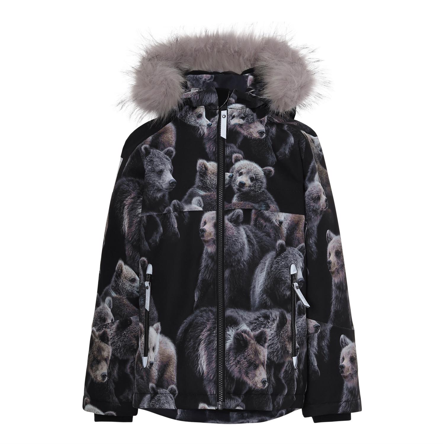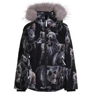 Castor is a lined and waterproof winter jacket in a sweet bear print. The jacket has a detachable hood with a faux fur edge (also detachable), a hidden zipper with a placket, hidden pockets, Molo's iconic star reflector on the back and elastic at the sleeves and bottom. The jacket is constructed in a windproof and waterproof quality that is breathable. It is lined in 3M™ Thinsulate™ and has high quality fleece in vulnerable places as well as taped seams. This product has a water resistant, PFC-free surface treatment (Does not contain, e.g. PFOS, PFOA, etc). The water column pressure and breathability are improved and are now 15.000 mm for the water column pressure and breathability: 15.000 g/m2/24hrs.