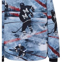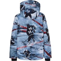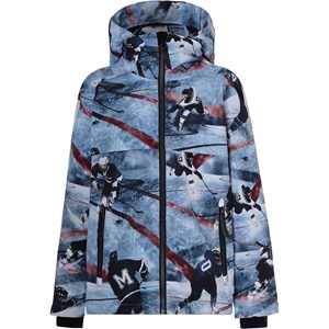 Castor is a lined and waterproof winter jacket in a print of ice hockey players. The jacket has a detachable hood, a hidden zipper with a placket, hidden pockets, Molo's iconic star reflector on the back and elastic at the sleeves and bottom. The jacket is constructed in a windproof and waterproof quality that is breathable. It is lined in 3M™ Thinsulate™ and has high quality fleece in vulnerable places as well as taped seams. This product has a water resistant, PFC-free surface treatment (Does not contain, e.g. PFOS, PFOA, etc). The water column pressure and breathability are improved and are now 15.000 mm for the water column pressure and breathability: 15.000 g/m2/24hrs.