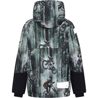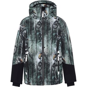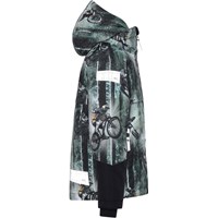 Castor is a lined and waterproof winter jacket in green with a print of mountain bikes. The jacket has a detachable hood, a hidden zipper with a placket, hidden pockets, visible reflectors on the sides of the sleeves and on the back. The jacket is made in a windproof, waterproof and breathable fabric, while the lining and the interlining are recycled and made of recycled polyester. This product has a water resistant, PFC-free surface treatment (Does not contain, e.g. PFOS, PFOA, etc). Water column pressure: 15.000 mm. breathable: 15.000 g/m2/24hr. They have straps with velcro for braces that can be purchased.