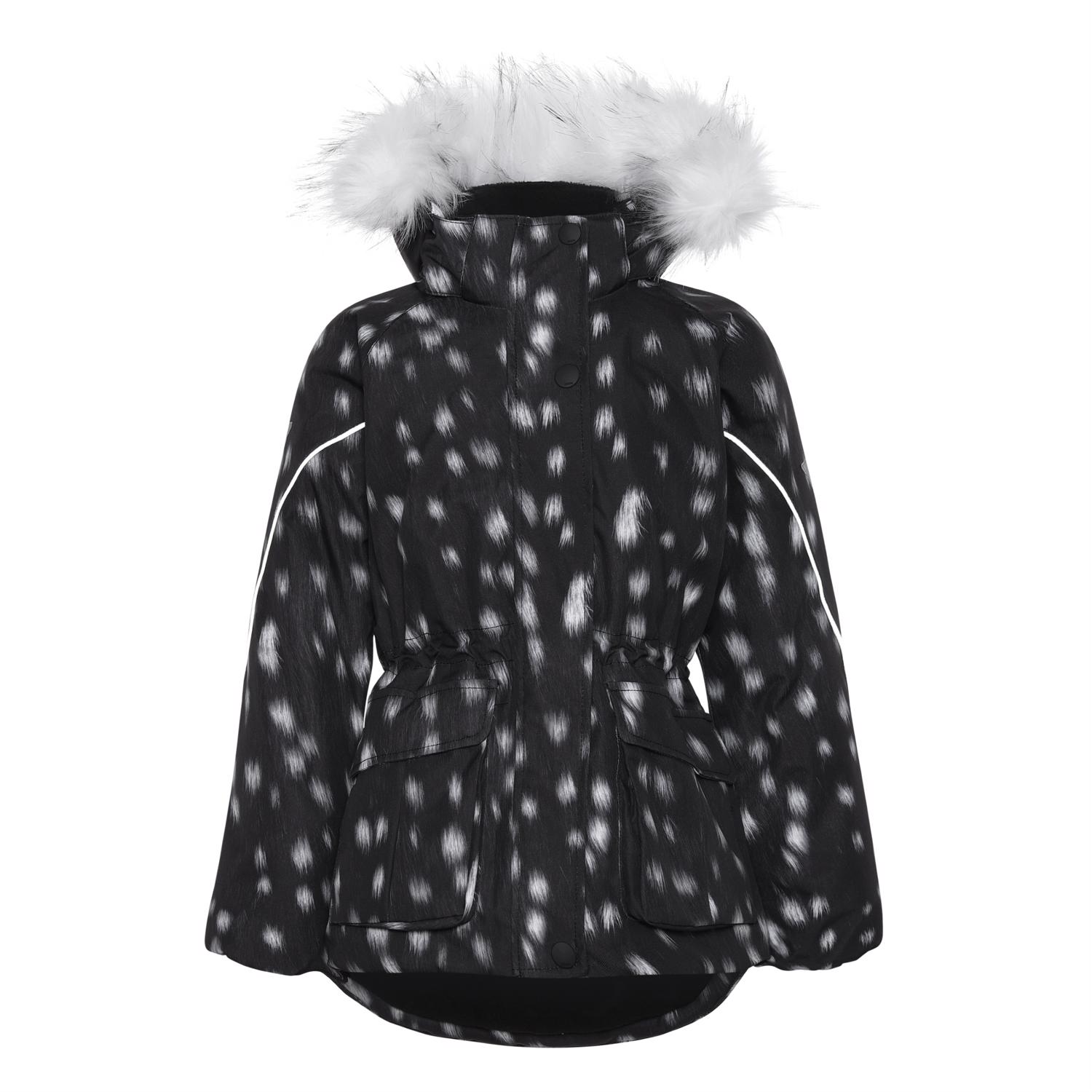 Cathy Fur is a waterproof winter jacket in black with white spots so it looks like the buckskin of a deer. It has a detachable hood with a detachable faux fur trim, a zipper down the front, roomy pockets, adjustable elastic waist and Molo's iconic star reflector on the back. The jacket is made in a windproof, waterproof and breathable fabric, while the lining and the interlining are recycled and made of recycled polyester. This product has a water resistant, PFC-free surface treatment (Does not contain, e.g. PFOS, PFOA, etc). Water column pressure: 15.000 mm. breathable: 15.000 g/m2/24hr. They have straps with velcro for braces that can be purchased.