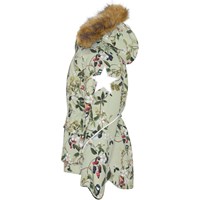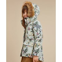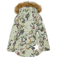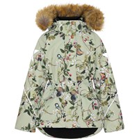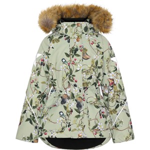 Cathy Fur is a waterproof winter jacket in green with a print of flowers and berries.Cathy Fur is perfect for extremely cold days but also ordinary winter days. The high level of breathability helps regulate a child's body temperature so it does not become too cold or over heated. On warmer winter days, a child can wear the jacket with a thin under layer, but on extremely cold days, you can add an extra layer underneath. Cathy Fur is also a good choice for less active moments. The jacket has a detachable hood with a faux fur edge (also detachable), a front zip closure, roomy pockets, adjustable elastic waist and Molo's iconic star reflectors on the back. The jacket is constructed in waterproof, windproof and breathable materials. The outer fabric is made from 45% recycled polyester, the 3M™ Thinsulate™ padding from 78% recycled polyester and the lining from 100% recycled polyester. This product has a water resistant, PFC-free surface treatment (Does not contain, e.g. PFOS, PFOA, etc). Water column pressure: 15.000 mm. Breathable: 15.000 g/m2/24hr.