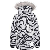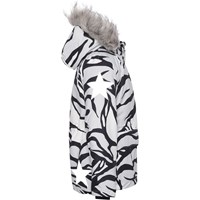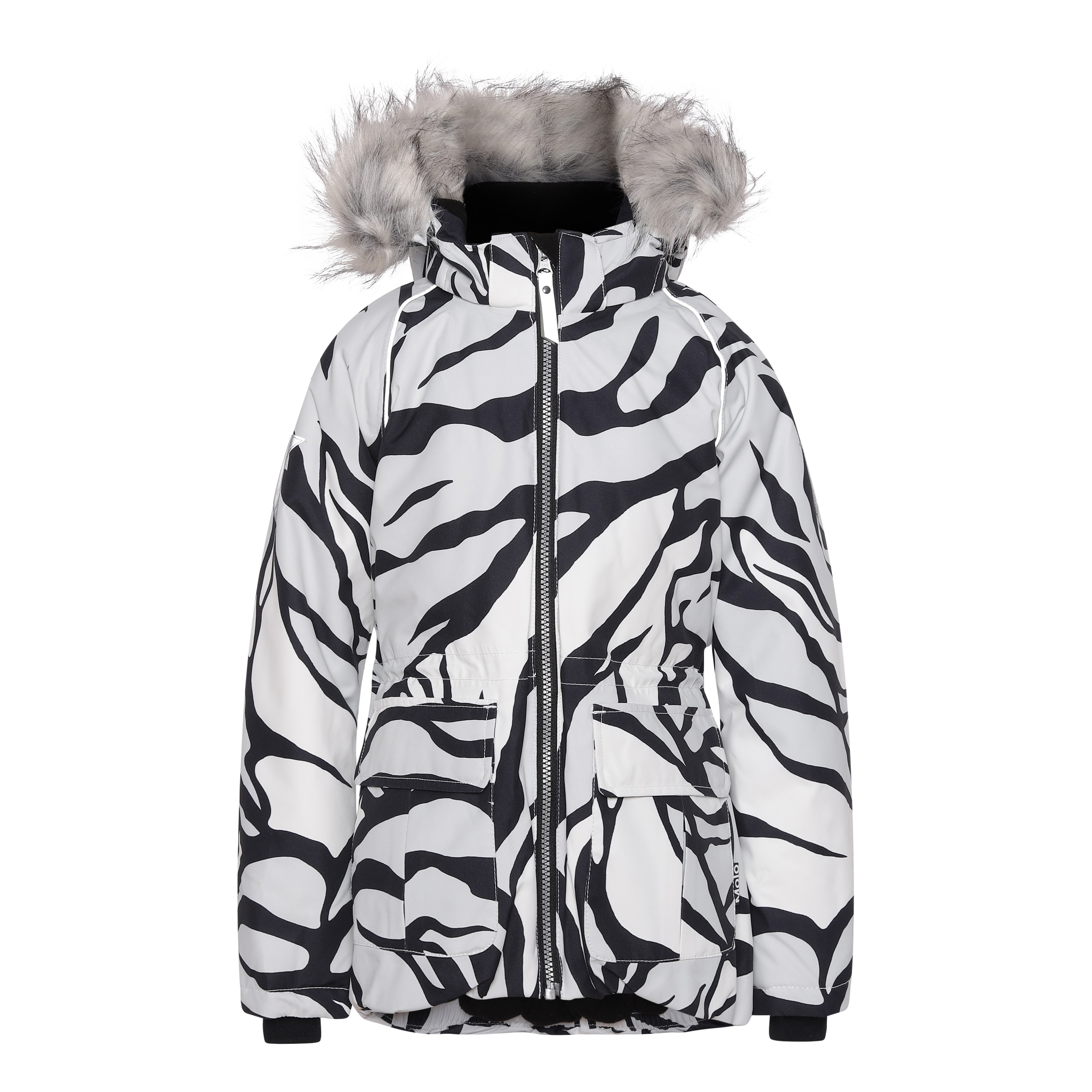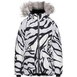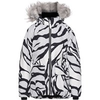 Cathy Fur is a waterproof winter jacket in white with a graphic tiger print. It has a detachable hood with a yellow faux fur edge that is also detachable, a front zip closure, roomy pockets, an adjustable elastic waist and Molo's iconic star reflector on the back. The jacket is constructed in a windproof, waterproof and breathable quality and has 3M™ Thinsulate™. It has a high quality fleece in vulnerable places and taped seams. This product has a water resistant, PFC-free surface treatment (Does not contain, e.g. PFOS, PFOA, etc). The water column pressure and breathability are improved and are now 15.000 mm for the water column pressure and breathability: 15.000 g/m2/24hrs.