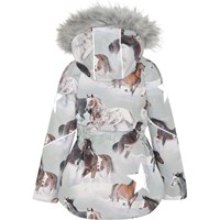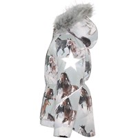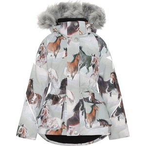 Cathy Fur is a waterproof winter jacket in light grey with a horse print. Cathy Fur is perfect for extremely cold days but also ordinary winter days. The high level of breathability helps regulate a child's body temperature so it does not become too cold or over heated. On warmer winter days, a child can wear the jacket with a thin under layer, but on extremely cold days, you can add an extra layer underneath. Cathy Fur is also a good choice for less active moments. The jacket has a detachable hood with a faux fur edge (also detachable), a front zip closure, roomy pockets, adjustable elastic waist and Molo's iconic star reflectors on the back. The jacket is constructed in waterproof, windproof and breathable materials. The outer fabric is made from 45% recycled polyester, the 3M™ Thinsulate™ padding from 78% recycled polyester and the lining from 100% recycled polyester. This product has a water resistant, PFC-free surface treatment (Does not contain, e.g. PFOS, PFOA, etc). Water column pressure: 15.000 mm. Breathable: 15.000 g/m2/24hr.