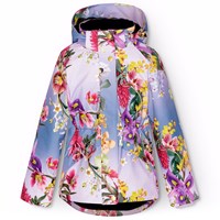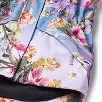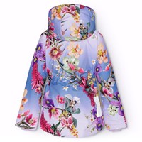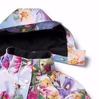 Wind- and waterproof winter jacket in recycled polyester for a cold winter with a print of beautiful flowers in fresh colours on a blue and purple background. The jacket has a detachable lined hood and a zipper with a flap that keeps snow, wind, and water out. The jacket has a large reflector on the back to increase visibility in traffic. The jacket has lined front pockets and an adjustable elastic waistband, providing shape and snugness around the body. The sleeves have ribbed cuffs which effectively keeps out wind, snow, and rain, while ensuring that gloves stay in place. The jacket is lined with 3M™ Thinsulate™, which provides the child with greater mobility.