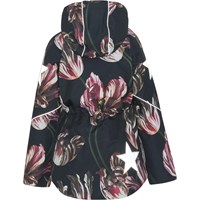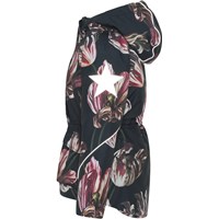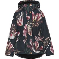 Cathy Fur is a waterproof winter jacket in black with a tulip print. Cathy Fur is perfect for extremely cold days but also ordinary winter days. The high level of breathability helps regulate a child's body temperature so it does not become too cold or over heated. On warmer winter days, a child can wear the jacket with a thin under layer, but on extremely cold days, you can add an extra layer underneath. Cathy Fur is also a good choice for less active moments. The jacket has a detachable hood with a faux fur edge (also detachable), a front zip closure, roomy pockets, adjustable elastic waist and Molo's iconic star reflectors on the back. The jacket is constructed in waterproof, windproof and breathable materials. The outer fabric is made from 45% recycled polyester, the 3M™ Thinsulate™ padding from 78% recycled polyester and the lining from 100% recycled polyester. This product has a water resistant, PFC-free surface treatment (Does not contain, e.g. PFOS, PFOA, etc). Water column pressure: 15.000 mm. Breathable: 15.000 g/m2/24hr.