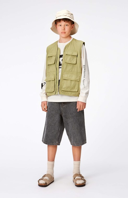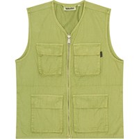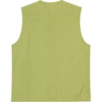 Olive green vest cotton. It has a zip closure, a wind flap and four pockets on the front with a lovely stitching detail.