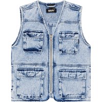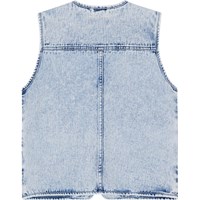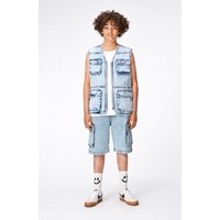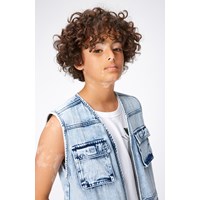 Blue denim vest with an acid wash look. The vest has a zip closure, a wind flap and four pockets on the front with a lovely stitching detail. You can wear it with matching shorts for a cool look.