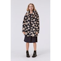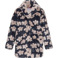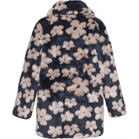 Soft and fluffy faux-fur coat in dark blue with beige flowers. The coat has a collar, snap buttons, and two side pockets.