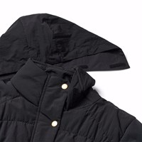 Water-repellent black jacket in recycled nylon. The jacket has raglan sleeves and a stylish silhouette with soft lines, giving it a sophisticated look. The jacket is knee-length with a stand-up collar and integrated hood. It has a zip with a flap that keeps out snow, wind, and water. The jacket has front pockets and elastic at the sleeve openings and bottom, which keeps out the wind and retains heat better. The jacket is lined with pearl padding, a recycled polyester filling that ensures consistent softness, optimal warmth, and easy maintenance when washing. The jacket's water-repellent surface is free from PFOS and PFOA.