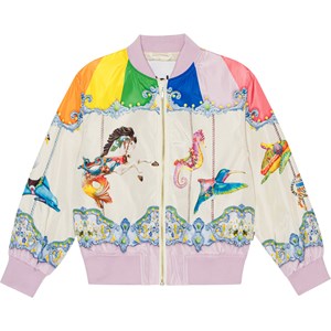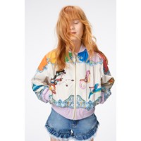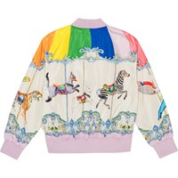 Colourful, water-repellent bomber jacket in 100% reycled polyester with a placement print of a fantastic animal carousel on the front, sleeves and on the back. The jacket has elastic rib at the neck, hips and wrists. The jacket has been treated with a water and dirt-repellent coating that does not contain chemicals like PFOS, PFOA, etc.