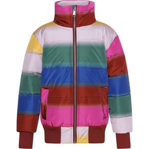 Halle is a bomber jacket in lovely rainbow colours and elastic rib at the sleeves and botton. The jacket is lined in pearl padding, which makes it extra soft and retains heat, while giving it a down-like feel. The lining and interling are 100% recycled and made of recycled plastic bottles. The outer fabric has a water resistant, PFC-free surface treatment (Does not contain, e.g. PFOS, PFOA, etc).