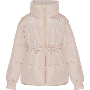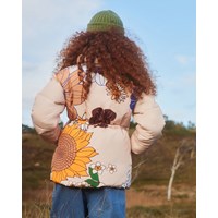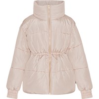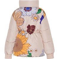 Light pink, water-repellent jacket with a zipper down the front, pockets on the sides, elastic wrists, a high collar with a concealed detachable hood, and elastic at the waist for adjustable silhouette and fit. On the back, the jacket features a decorative print of various retro-style flowers. A water- and dirt-repellent coating has been applied without the use of chemicals like PFOS, PFOA, and similar substances."