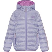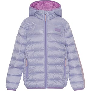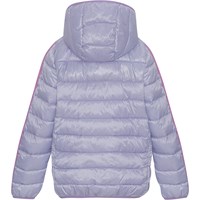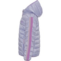 Lightweight, water-repellent down jacket in purple with a zipper down the front, detachable hood, decorative striped bands along both sleeves, and zip pockets on both sides. The jacket is lined with imitated down filling called Pearl Padding, which provides consistent softness, retains heat well, and makes washing easier. A water- and dirt-repellent coating has been applied, without the use of chemicals like PFOS, PFOA, and similar substances.
