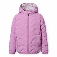 Pink water-repellent puffer jacket made of recycled nylon. The jacket has a detachable hood, a stand-up collar, a zipper with chin guard, and zip pockets on the front.