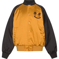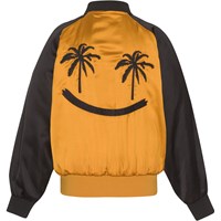 Harly is a bomber jacket in gold with black sleeves and a lovely smiley face embroidery on the back. The smiley face"s eyes are two palm trees. The jacket has a button closure and pockets on the front.
