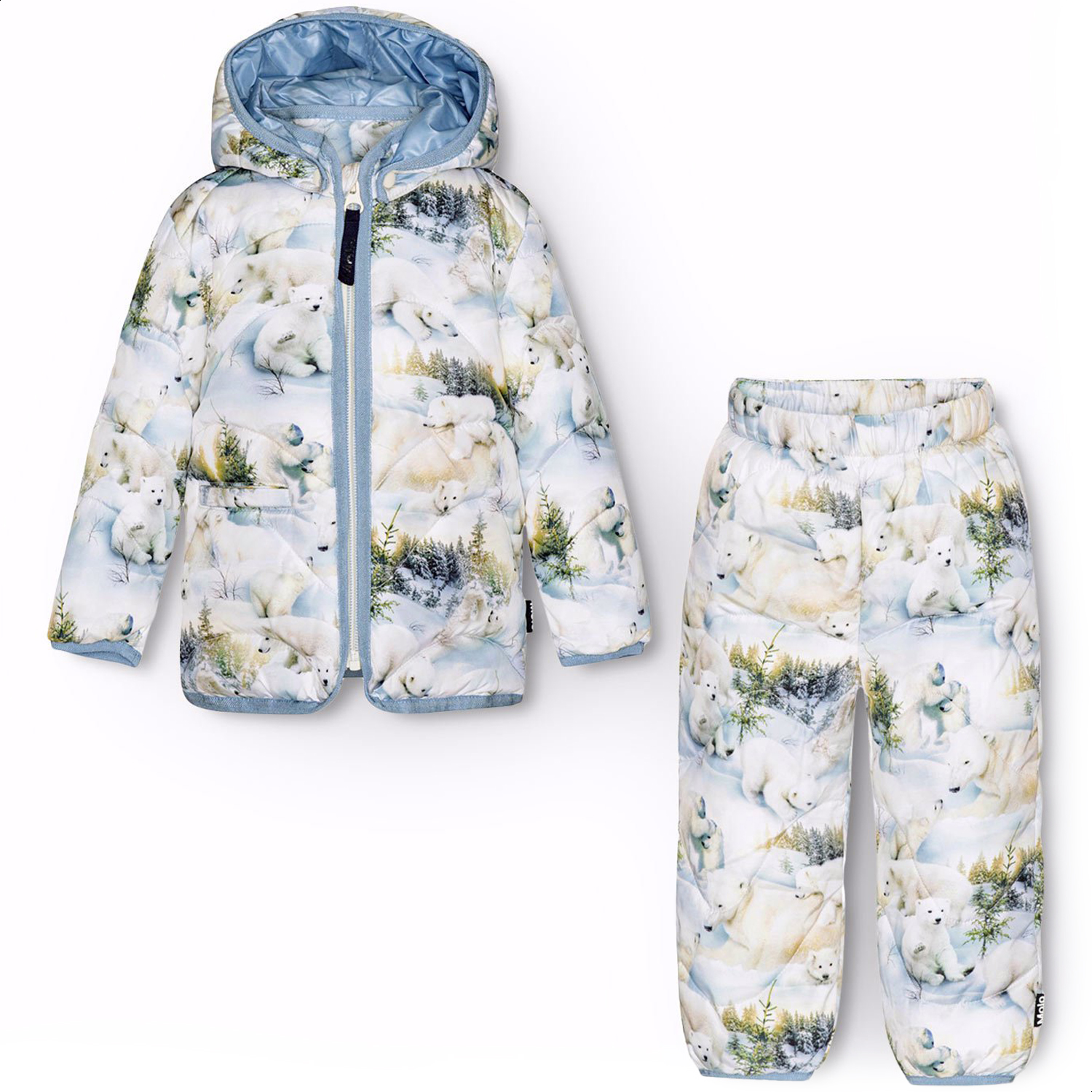 Water-repellent, soft, and light thermal set for the little ones, with light blue lining and edging. The jacket has a detachable hood, a stand-up collar, a zipper with a chin guard, and a single front pocket. The pants have an elastic waistband with an adjustable inner elastic. The set features an all-over print of a snow landscape with playful polar bears. The jacket, pants, and padding are made of recycled polyester. The water-repellent surface is free from PFOS and PFOA.