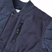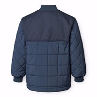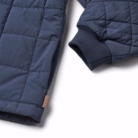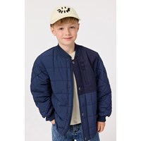 Dark blue, quilted, water-resistent thermal jacket in recycled nylon with canvas details and a zip chest pocket. The jacket has a regular fit, side pockets, a zip with wind flap, and ribbed edges at the neck and sleeves to protect against the wind.