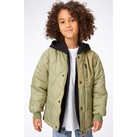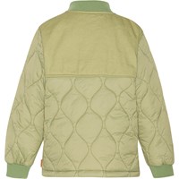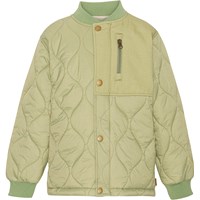 Quilted, water-repellent jacket in light green with decorative canvas panels on the left chest and at the top of the back. The jacket has a chest pocket, discrete side pockets, rib at the neck and wrists and a concealed, zip front closure with a wind flap and practical snaps. The jacket has been treated with a water and dirt-repellent coating that does not contain chemicals like PFOS, PFOA, etc.