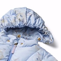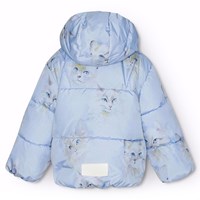 Water-repellent light blue jacket for babbies and toddlers in recycled polyester with a print of watercolour-painted cat faces. The jacket has a detachable hood, zipper, and pockets on the front, as well as elastic at the sleeve openings and bottom which helps your child stay warm. The jacket is lined with pearl padding, a recycled polyester filling that ensures consistent softness, optimal warmth, and easy maintenance during washing. The jacket's water-repellent surface is free from PFOS and PFOA.