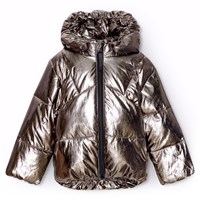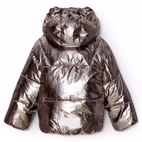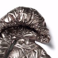 Cool silver jacket for babbies and toddlers. The jacket has a detachable hood, zipper, and pockets on the front, as well as an elastic at the sleeve opening and bottom, which helps your child stay warm.