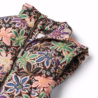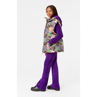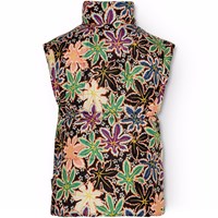Quilted vest in recycled polyester with a beautiful multicoloured print of maple leaves in various colours. The vest has a stand-up collar, front zip, and large armholes, allowing for a jacket or thick sweater to be worn underneath. It has front pockets and an internal waist elastic, which helps to create a flattering silhouette. The water-repellent surface is free from PFOS and PFOA.