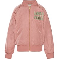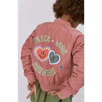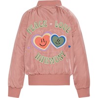 Pink bomber jacket with heart embroideries and ''Peace, love and harmony''. The jacket has a zip front closure and side pockets.