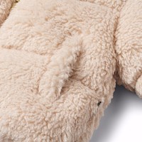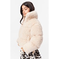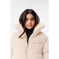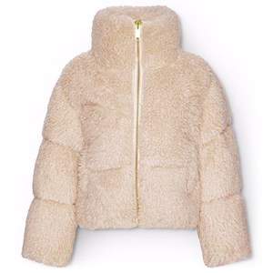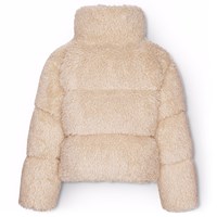Padded, off-white faux fur jacket with shearling look. The jacket has a stand-up collar, front pockets, and a zip closure.