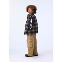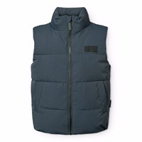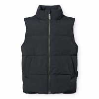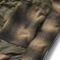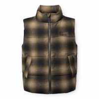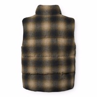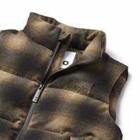 Checkered brown puffer vest made of recycled polyester and wool. The puffer vest features a practical zip closure, high collar, and large armholes, allowing for a jacket or thick sweater to be worn underneath. It has front pockets, an inner pocket, and adjustable internal elastic bands at the bottom to help keep the wind out.