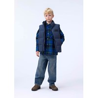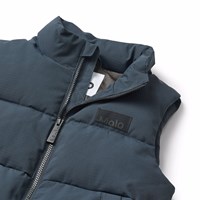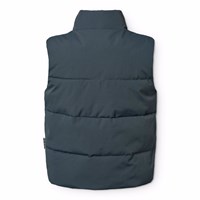 Dark blue puffer vest made of recycled nylon with a front zip, high collar and large armholes, allowing for a jacket or thick sweater underneath. The puffer vest has front pockets, an inner pocket, and an adjustable internal elastic at the bottom to help keep the wind out.