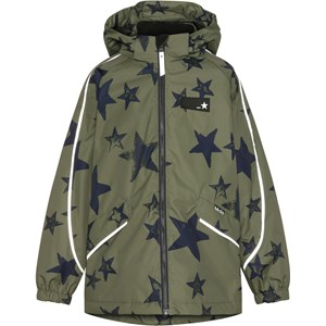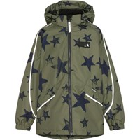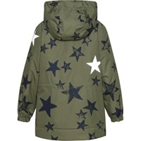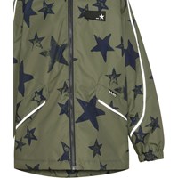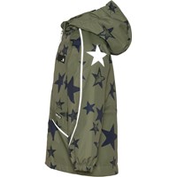 Heiko is Molo's new unisex jacket in green with a star print. The jacket has reflective piping and Molo's iconic star reflectors on the front and the back. The jacket can be cinched with ties at the waist to create a more shapely fit. Heiko is windproof, waterproof and breathable and has taped seams. The lining and the interlining are 100% recycled and made of recycled plastic bottles. This product has a water resistant, PFC-free surface treatment (Does not contain, e.g. PFOS, PFOA, etc). Water coloumn pressure: 12.000 mm and breathable: 8.000 g/m2/24hr.