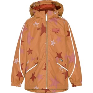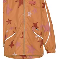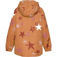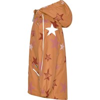 Heiko is Molo's new unisex jacket in a lovely golden colour with a star print. The jacket has reflective piping and Molo's iconic star reflectors on the front and the back. The jacket can be cinched with ties at the waist to create a more shapely fit. Heiko is windproof, waterproof and breathable and has taped seams. The lining and the interlining are 100% recycled and made of recycled plastic bottles. This product has a water resistant, PFC-free surface treatment (Does not contain, e.g. PFOS, PFOA, etc). Water coloumn pressure: 12.000 mm and breathable: 8.000 g/m2/24hr.