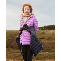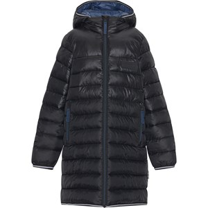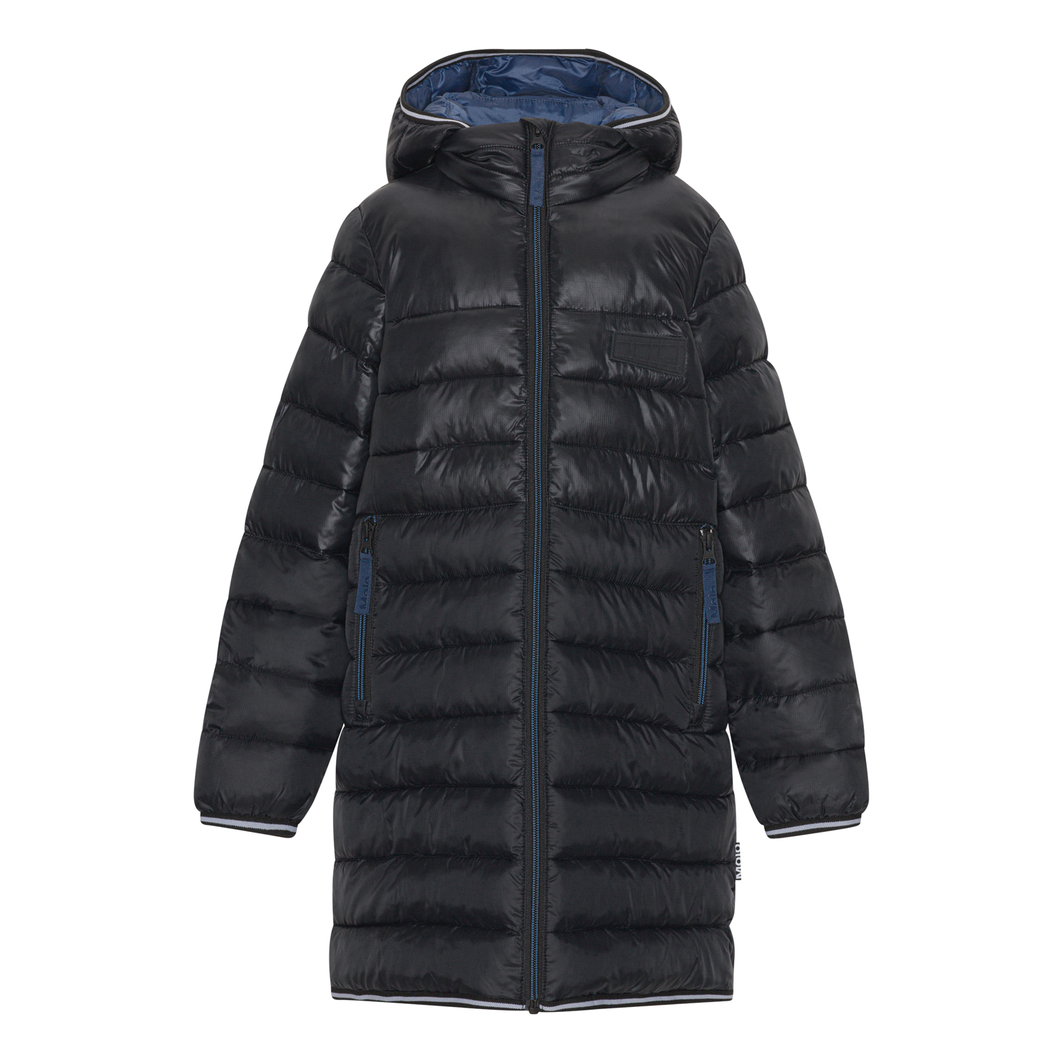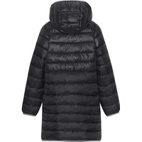 Lightweight, water-repellent down coat in black with a zipper down the front, detachable hood, and zip pockets on both sides. The coat features blue details on the zippers and striped trim at the sleeves and bottom. It is lined with imitated down filling called Pearl Padding, which provides consistent softness, retains heat well, and makes washing easier. A water- and dirt-repellent coating has been applied without the use of chemicals like PFOS, PFOA, and similar substances.