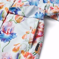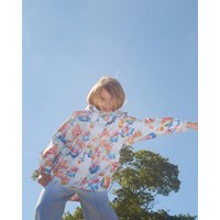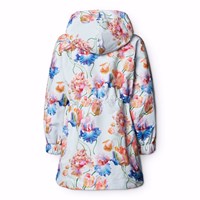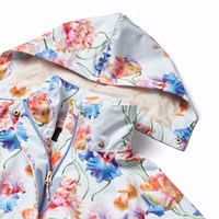 Light blue wind- and waterproof jacket in recycled polyester with a colourful print of artistic tulips. The jacket features a detachable hood, side pockets with pocket flap details, a wind flap at the zipper, and elastic and adjustable velcro at the cuffs to effectively keep the wind out. Inside, it has an adjustable elastic at the waist to adjust the jacket's silhouette and fit.